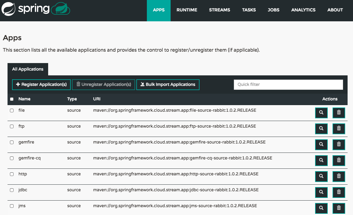 docker-compose命令停止发出日志消息后,Spring Cloud Data Flow将可以使用。此时,在浏览器中导航到Spring Cloud Data Flow仪表板。默认情况下,将自动导入最新的GA版本的Stream和Task应用程序。 -